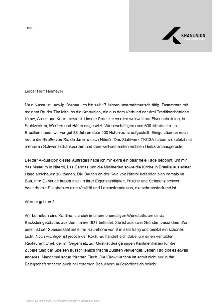 Ausgangspunkt war ein Brief des Techne Sphere Leipzig Gründers Ludwig Koehne an den brasilianischen Architekten, in dem die Idee einer Kantinenerweiterung für den Standort ins Gespräch gebracht wurde.